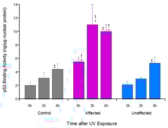 p53 promoter binding activity by dFb from affected LFS compared to unaffected or control subjects in response to UV exposure. TF-Detect Human p53 Activity Assay Kit (GeneCopoeia, Rockville, MD, USA) was used to compare amount of consensus p53 promoter binding site activity in nuclear protein extracts from proliferating dFb ±UV irradiation, according to manufacturer’s recommendations (n = 4: * p < 0.05, affected vs. unaffected dFb; † p < 0.05, affected vs. control dFb; ‡ p < 0.05, vs. -UV irradiation (time = 0 h)).
