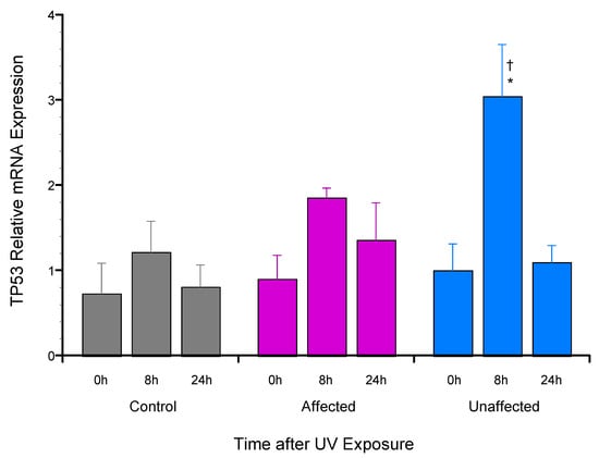 To investigate potential molecular mechanisms regulating the previously reported TP53 allele-specific expression in the unaffected dFb [18], the expression of total TP53 mRNA was first compared by RT-qPCR analysis following UV exposure. This comparison found significantly increased total TP53 mRNA expression in the unaffected dFb vs. both affected and control dFb 8 h after UV exposure (Figure 4).