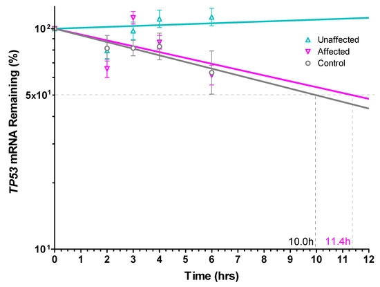 A prominent role for mRNA stability in regulating TP53 expression has been described [42,43,44], often superseding transcriptional control [45,46]. Consequently, the total TP53 mRNA half-life was compared in UV-induced dFb from the unaffected parent vs. the affected LFS and unrelated control subjects to determine its possible contribution to the higher UV-induced total TP53 mRNA expression found in the unaffected dFb (Figure 4). The results of this study found a comparable 10–11 h transcript half-life in both affected and control dFb (Figure 5). This relatively long TP53 mRNA half-life is consistent with that reported previously in other cells [42,43,46]. However, the UV-induced TP53 mRNA expressed by the unaffected dFb was found to be completely stable throughout the duration of this study (Figure 5). This higher TP53 mRNA stability very likely plays a role in the observed upregulation of the total TP53 mRNA expression in the unaffected dFb (Figure 4).