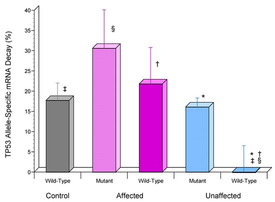 Additionally, this finding suggested that the previously reported preferential expression of the wild-type TP53 allele by the unaffected dFb may be regulated by its allele-specific mRNA stabilization. To investigate this possibility, the custom RT-PCR-RFLP assay previously designed to detect the TP53 mutation in this LFS family [18] was modified to measure allele-specific mRNA decay by including amplification of B2M as a stable reference standard [23,25]. This analysis found that, while 21.8 ± 9.0% and 17.7 ± 4.3% of wild-type TP53 mRNA had decayed after 6 h in affected and control dFb, respectively, essentially none (−0.1 ± 6.6%) had decayed in the unaffected dFb (Figure 6), as was also the case for total TP53 mRNA (Figure 5). Although less of the mutant TP53 mRNA also appeared to be decayed in the unaffected (16.1 ± 2.2%) vs. the affected (30.6 ± 9.5%) dFb, this difference (Figure 6) was not significant (p > 0.05). Additionally, the difference between wild-type (21.8 ± 9.0%) and mutant (30.6 ± 9.5%) TP53 mRNA decay in the affected dFb (Figure 6) was not significant either (p > 0.05).
