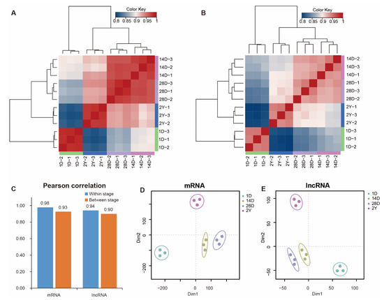 We used hierarchical clustering and Pearson’s correlation to analyze the expression of mRNAs and lncRNAs in each sample (Figure 2A,B and Figure S1). We found that mRNA and lncRNA expression data in pigeon breast muscles were mainly grouped into four clusters according to the developmental stages. At the same time, the 14D and 28D stages were clustered together and then clustered with the 2Y stage, while the major branch of the cluster was presented in 1D and other stages. Additionally, we also noted that mRNAs between the adjacent two stages had greater Pearson’s correlation coefficients than lncRNAs (Figure 2C). Similarly, the result of the t-SNE analysis indicated that the mRNA and lncRNA expression profiles of 12 samples appeared in a stage-specific manner (Figure 2D,E).