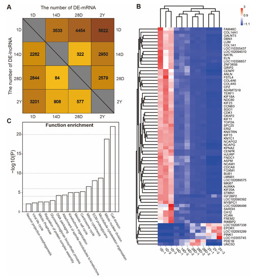 The identification and functional analysis of differently expressed genes. (A) The number of DE-mRNAs and DE-lncRNAs between stages (1D versus 14D, 1D versus 28D, 1D versus 2Y, 14D versus 28D, 14D versus 2Y, and 28D versus 2Y). (B) The expression heatmap of common differentially expressed mRNAs and lncRNAs. (C) The functional enrichment analysis was performed on the down-regulated expression of common DE-mRNAs.