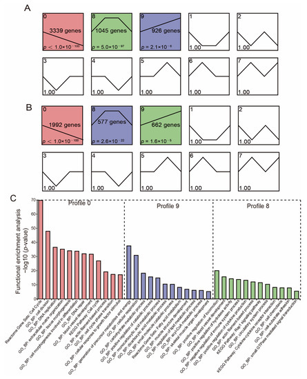 Time-course gene expression and functional enrichment analysis. (A,B) Time—series modules of DE-mRNAs (A) and DE-lncRNAs (B) are shown. The significantly enriched profiles are red, purple, and green colored (p < 0.05). The numbers in the upper-left corner of each pane denote the profile number; the numbers in the middle of each pane denote the number of genes in each profile; the numbers in the lower-left corner of each pane denotes the p-value of each profile. (C) Functional enrichment analysis of DE-mRNAs corresponding to significant profiles.