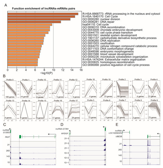 The trans/cis analysis of DE-lncRNAs and DE-mRNAs. (A) Functional enrichment analysis of DE-mRNAs that were significantly correlated and adjacent to the DE-lncRNAs. (B) The expression trends of DE-lncRNAs that were significantly correlated and adjacent to DE-mRNAs. (C–E) The loci and expression levels of the representative lncRNA-mRNA pairs: G12653 and PAX7 (1D, 14D, 28D, and 2Y), G7364 and MYDGF (1D and 2Y), and LOC102093252 and UBE2B (1D, 14D, 28D, and 2Y).