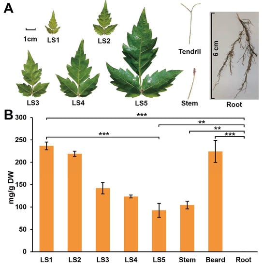 Spatial DHM content in A. grossedentata. (A) Five stages of leaves, stems, tendrils and roots. The 6-cm scale bar was used for roots and the 1-cm scale bar was used for LS1–LS5, stems, and tendrils. (B) Dry DHM weight contents in different tissues of A. grossedentata (** p < 0.01, *** p < 0.001). Abbreviations: DHM, dihydromyricetin; LS, leaf stage.