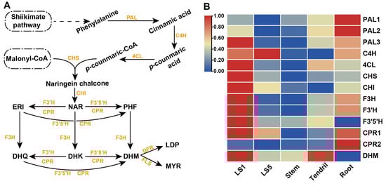 The analysis of gene expression level (Figure 2B) showed that all genes (except PAL1, PAL2, and CPR2) were highly expressed in LS1. The hydroxylation genes had different expression levels in different tissues. The expression levels of AgF3H and AgF3′H decreased from LS1, to tendrils, to LS5, and to stems. AgF3′5′H had the highest expression in both LS1 and tendrils. The expression intensity of AgF3′5′H in each sample decreased from LS1, to tendrils, to stems, and to LS5, which followed the same trend as the DHM content. Although the roots did not contain DHM, the expression of AgF3H, AgF3′H, and AgCPR1 was relatively high.