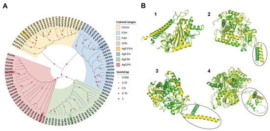 Phylogenetic analysis of NAR hydroxylase and tertiary structure prediction. (A) Red, green, yellow, and blue represent F3H, F3′H, F3′5′H and CPR from different sources, respectively, and corresponding dark colors represent AgF3H, AgF3′H, AgF3′5′H and AgCPR. (B1) Yellow one was AgF3H, and the green represents CsF3H. (B2) Yellow one represents AgF3′H, and the green represents SmF3′H. (B3) Yellow one represents AgF3′5′H, and the green represents SlF3′5′H. (B4) Yellow one represents AgCPR1, and the green represents SmCPR. Transmembrane domains are shown within the circle. Alphafold2 was used to predict the protein tertiary structure and then PyMol software (New York, NY, USA) was used for protein tertiary structure alignment.