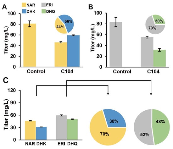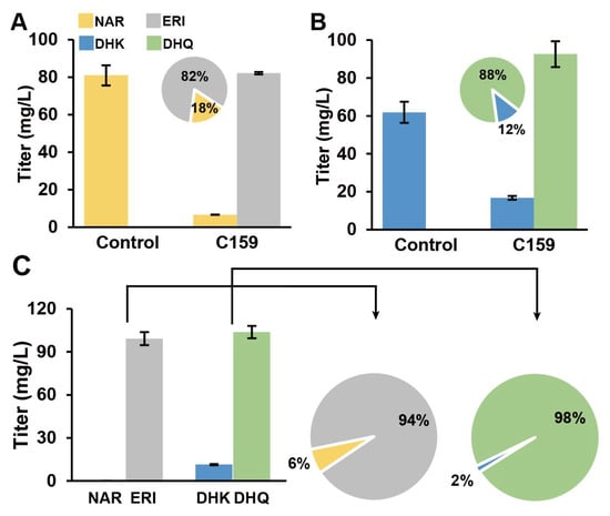 AgF3′H was P450 monooxygenase, which required the collaborative expression of AgCPR1 to realize its function. AgF3′H and AgCPR1 catalyzed the formation of 82.20 mg/L ERI from 100 mg/L NAR and 92.63 mg/L DHQ from 100 mg/L DHK. The molar conversion was approximately 82% and 88% (Figure 6A,B). C159 catalyzed the generation of 99.25 mg/L DHK and 103.80 mg/L DHQ from 100 mg/L NAR and 100 mg/L ERI when NAR and DHK existed simultaneously. The molar conversion was approximately 94% and 98% (Figure 6C).
