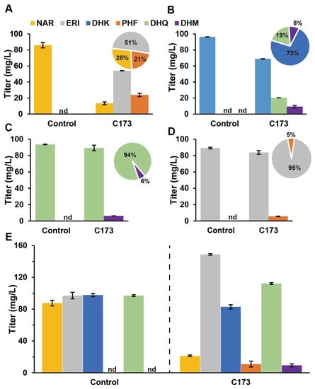- Leonard, E.; Yan, Y. Strain improvement of recombinant Escherichia coli for efficient production of plant flavonoids. Mol. Pharm. 2008, 5, 257–265. [Google Scholar] [CrossRef] [PubMed]