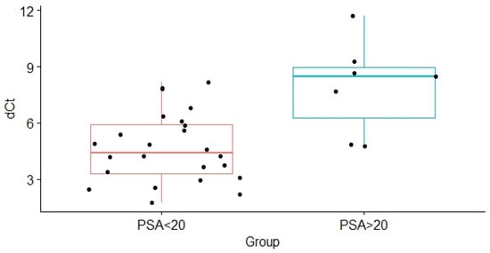 | PSA ≤ 20/PSA > 20 | 4.69 ± 1.84/7.92 ± 2.47 | 0.012 |