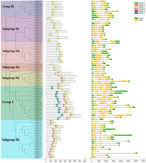 The MEME program was used to predict the conserved motifs of PtWRKY proteins, and six conserved motifs identified (namely, motifs 1 to 6) were all distributed in the WRKY domain of each protein. The obtained results show that motif 4 was found only in group I, and motif 1 was also mainly found in group I, and both together formed its N-terminus WRKY domain. The WRKY structure at the C-terminal of group I contained four other motifs, and the motif composition was the same as that of the WRKY domain of subgroups IIb and IIc. Group II and III proteins lacked motif 5 at the N-terminal compared with the C-terminus WRKY domain of group I (Figure 1).