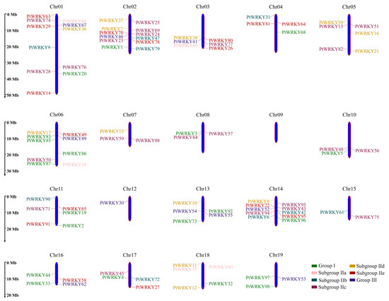 Chromosomal mapping of PtWRKYs. The blue bars displayed the chromosome of poplar. Genes IDs with different colors belong to different subgroups.