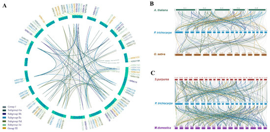Intraspecific and interspecific collinearity analysis of WRKYs. Intraspecific collinearity of PtWRKYs (A). Interspecific collinearity analysis of PtWRKYs against Arabidopsis and rice (B), or against willow and apple (C).
