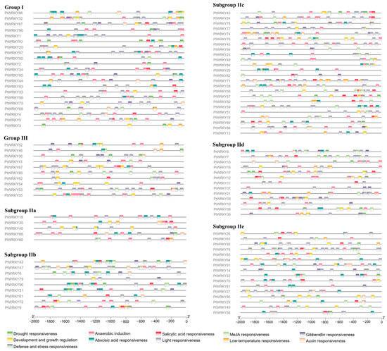 Cis-acting elements in PtWRKYs promoter. Line represents 2000 bp gene upstream sequence, and different color rectangles represent different response elements.