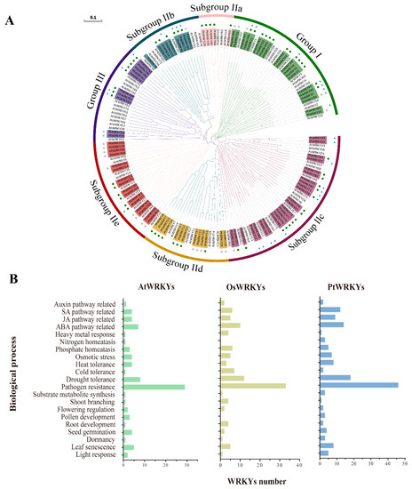 Phylogenetic analysis has become one of the most rapid and relatively accurate approaches used to identify the function of TF proteins according to the conservation of protein sequences [9]. Previous reports on the function of homologous WRKY proteins in other plant species may serve as a reference for verifying the potential roles of PtWRKYs. Several studies have been conducted on various model plants to elucidate the mechanism and function of WRKYs. These studies have particularly focused on PtWRKYs regulating tolerance to biotic and abiotic stresses, including pathogens, wounding, drought, cold, salt, hypoxia, heat and VU-B [11,73,74,75,76]. In addition, WRKY transcription factors are related to plant morphogenesis and metabolite synthesis, as well as important regulators of plant hormone signaling, and play an important role in plant local or systemic stress responses [1]. Therefore, a phylogenetic tree and annotation plots based on previous studies were conducted to determine the functions of PtWRKYs (Figure 5). The functions of PtWRKYs were divided into 21 categories, mainly involved in plant hormone signaling pathways, biotic stress response, abiotic stress responses, nutrient element uptake, plant morphogenesis and so on (Figure 5 and Supplementary Table S3). Clearly, WRKYs with pathogen resistance functions were the most abundant in both Arabidopsis and rice, which may be attributed to the stronger preference of researchers for this aspect of WRKY function when studying its function [9]. Therefore, it is possible that these genes also contain other functions. In fact, a large amount of data indicates that a particular WRKY TF is often simultaneously involved in several plant life processes. For example, AtWRKY6 modulated both seed germination and phosphate homeostasis [77,78], PtWRKY75 regulated JA and ROS pathways [79,80], and OsWRKY72 was involved in flowering regulation, stem development and osmotic stress tolerance. Normally, WRKY TFs activate or repress the transcriptional expression of target genes by binding to the widely spread W-box in the promoter region with their WD [80]. This is one of the reasons why WRKY TFs play an important role in signaling within plant cells. In-depth exploration of the functional diversity of WRKYs will help to provide new insights into the functional characteristics of WRKYs, and is more conducive to clarifying the role of WRKYs in the process of multi-signal crosstalk in plant cells, such as nutrients, pathogens, stress and hormones [81,82,83,84]. This finding lays a theoretical foundation for the subsequent functional identification of PtWRKYs.