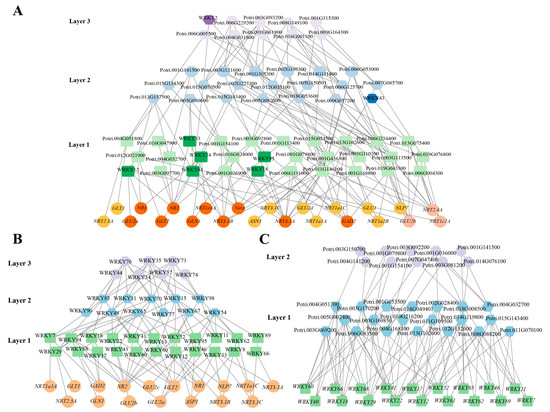 We applied the BWERF algorithm to the nitrogen response pathway for reverse-engineering ML-hGRNs. The last layer was considered to govern the nitrogen primary response, including genes involved in nitrate transport, reduction and assimilation (Figure 6). The ML-hGRNs constructed from NRGs and all TFs in poplar indicated that PtWRKYs played a role in the nitrogen response. The obtained results show that there were eight PtWRKYs involved in the regulation of NRG expression, accounting for 13% of all transcription factors in the network (Figure 6A). Six PtWRKYs were shown in the first layer. That is, they probably regulate NRGs directly. To screen for more potential nitrogen response-related PtWRKYs, an NRG-based ML-hGRN was further constructed with only PtWRKYs (Figure 6B). Clearly, in addition to the above-mentioned eight PtWRKYs, others (such as PtWRKY40, PtWRKY60 and PtWRKY22) were also potential regulators of NRGs. These PtWRKYs were also regulated by many other transcription factors at the transcriptional level (Figure 6C).