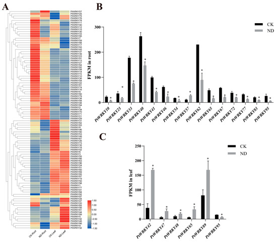 PtWRKYs transcription expression level under LN. Heat map of PtWRKYs expression obtained from transcriptome sequence data (A). Differently expressed PtWRKYs in poplar roots (B) or leaves (C). CK, the control group; ND, the nitrogen deficiency group. According to independent sample t-test results, “*” indicated significant difference in gene expression compared with control (CK) (p ≤ 0.05).