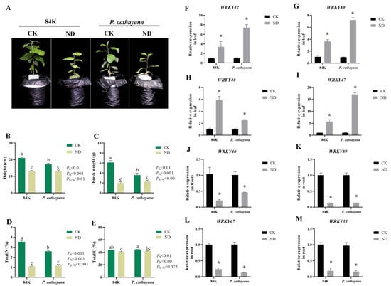 RT-qPCR analysis of PtWRKYs responding to nitrate. Growth inhibition of poplars treated after nitrogen deficiency (A–E). The relative expression levels of PtWRKYs in different poplar leaves (F–I) and roots (J–M) after nitrogen deficiency. CK, control group with normal nitrogen; ND, N-deficiency treatment group. Each set had three biological replicates and showed the mean ± standard error. According to the ANOVA analysis of the Turkey test, different letters indicate significant differences (p ≤ 0.05). According to independent sample t-test results, “*” indicated significant difference in gene expression compared with control (CK) (p ≤ 0.05).