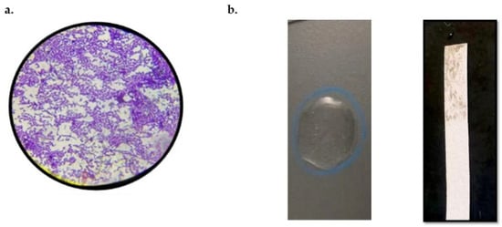 Strain KAE01, isolated from yogurt and identified using morphological, biochemical, and molecular techniques, was selected for the study. Strain KAE01 is Gram-positive, catalase- and oxidase-negative, and rod-shaped (Figure 1). It was also able to produce ammonia from arginine and ferment different carbohydrates, such as galactose, raffinose, fructose, dextrose, maltose, mannose, and sucrose. Based on these tests, strain KAE01 was found to belong to the genus Enterococcus []. Species-level identification was performed using 16S rDNA amplification and sequencing. The size of the amplified PCR product was found to be approximately 500 bp (Figure 2a). The PCR product was sequenced and used for a homology search for 16S rDNA sequences available in the database using BLAST (NCBI). The phylogenetic analysis of sequences closer to the sequence obtained based on the BLAST result showed 99.9% similarity to Enterococcus faecium NRIC 0677, as shown in Figure 2b. The sequence was submitted to GenBank (NCBI) with the accession number MZ604300.1.