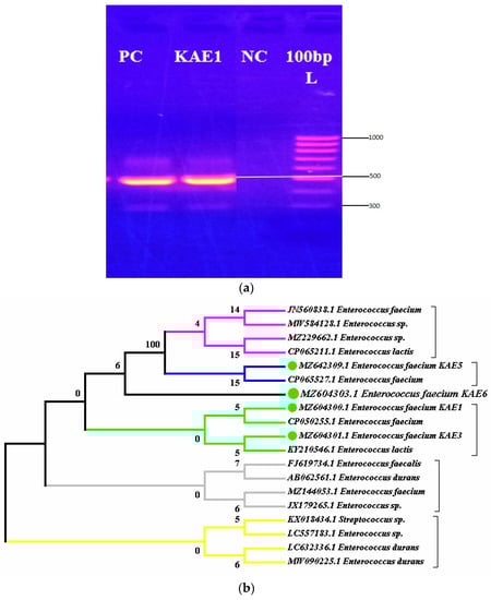 (a) Agarose gel electrophoresis showing Positive Control (Lane 1), 16s rDNA fragment amplified by PCR from genomic DNA of strain KAE01, corresponding to 500 bp (Lane 02), Negative Control (Lane 3), and DNA molecular weight marker of 1000 bp (Lane 4). (b) Phylogenetic tree constructed based on 16s rDNA sequence amplified from genomic DNA of strain E. faecium KAE01 and other strains obtained from BLAST results.