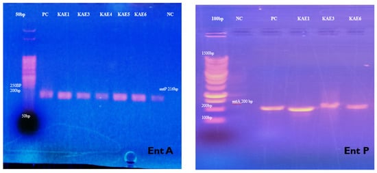 Agarose gel electrophoresis of EntA and EntP genes showing bands at 200 bp and 216 bp, respectively.