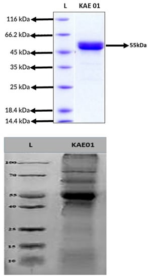The Tricine SDS-PAGE results revealed a peptide band of 55 kDa (Figure 5). The P. aeruginosa strains, i.e., PA01, PA02, and PA03, were inhibited by the enterocin KAE01 band, which was found to be consistent with the SDS-PAGE findings and indicated that a pure protein sample had been obtained. By using the active band from the SDS-PAGE gel, it was recognized as a bacteriocin because of the molecular weight of 55 kDa (5 mg/mL using ImageJ software: http://rsbweb.nih.gov/ij/download.html (accessed on 21 October 2022) with reference to the standard protein ladder ranging from 10 to 100 kDa using SDS-PAGE electrophoresis. Based on the identified sequences of the EntA and EntP genes, the amino acid sequences of the corresponding proteins were predicted as LANFALHFAHRAKAIANARAVVRAQAFLNRAHVRLAPVHAAALFGAIHAVAIIFAAMKFHMMHAPAVAPNFQKAQRNKAQRAKGKRARAQRVH for EntP and MKKAKLILSTVLTSLCSGFLGTGTVDASEYNNKVVSLRAASDTTLTVSRIPHNPILYFEISMENYNQSDSTQRWVME for EntA.
