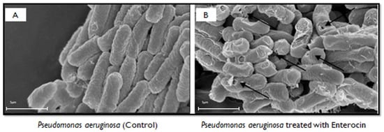 The indicator strains of P. aeruginosa were exposed to enterocin KAE01 and investigated by SEM. The cultures of the indicator strains were treated with enterocin KAE01 in their exponential phase (optical density of 0.6 at 600 nm) and incubated for 2 h at 37 °C. The control groups were grown without enterocin. The treated and control samples were harvested, washed with potassium phosphate buffer, and fixed with 2.5% (v/v) glutaraldehyde at 4 °C for 4 h. The samples were then dehydrated with gradient alcohol solutions (30%, 50%, 70%, 85%, 90%, and 100%). After lyophilization and gold coating, the samples were observed by scanning electron microscopy (S4800, Hitachi, Japan) [].