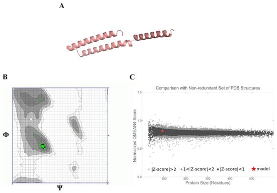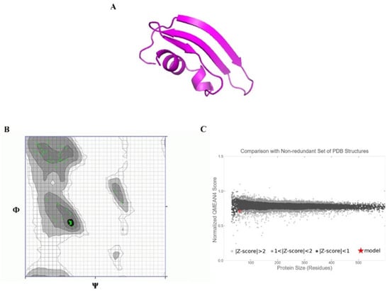 Matrix protein model: (A) ribbon view of matrix protein model, (B) Ramachandran plot, and (C) qmean Z-score plot.