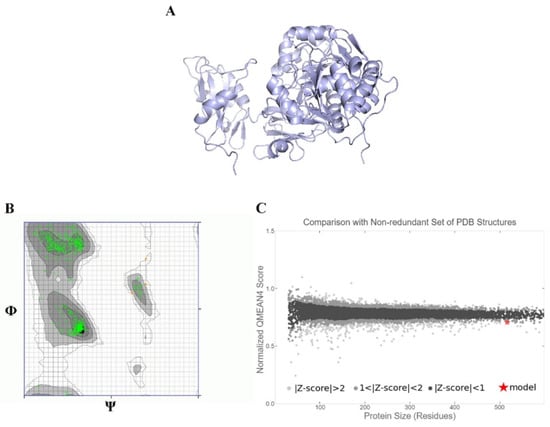 KAE01 EntP model obtained from AB method: (A) ribbon view of 3 KAE01 EntP model, (B) Ramachandran plot, and (C) qmean Z-score plot.