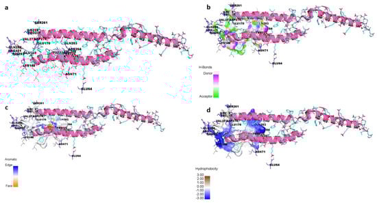 EntA was observed to exhibit active binding since some amino acid residues, such as SER261, GLN292, ILE259, ASP274, ARG151, and LYS148, were found to stabilize peptide binding through hydrogen-bonding interactions (Figure 10a,b). In addition, GLU64, ASN71, GLN203, VAL277, GLU170, and ASN204 were observed to interact through π–π and hydrophobic interactions, as shown in (Figure 10c,d).