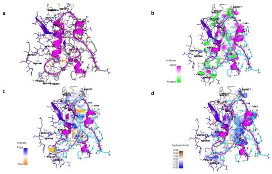 Similarly, the binding of EntP was also found to be stabilized by different types of interactions with protein amino acid residues such as ASP275, ASP295, ASN195, TYR105, and MET372, which were observed to form hydrogen-bonding interactions with the peptide. Moreover, ASN 377, PRO370, SER193, PHE 371, MET 372, and ILE 193 were found to interact through π–π and hydrophobic interactions (Figure 11).
