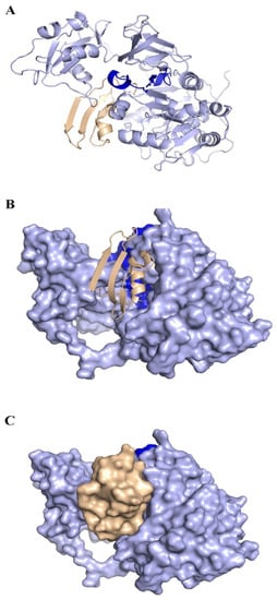 KAE01 EntP complexed with matrix protein. KAE01 EntP model (wheat color) with AB method complexed with matrix protein (light-blue color). Highly conserved residues Gly307, Gly302, Ala278, Gly279, His308, and Tyr211 in N-terminal domain are highlighted in dark blue. (A) Shows Ribbon representations (B) KAE01 Cavity occupied surface of protein (C) Both are represented in surfaces.
