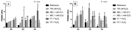 - Vriend, J.; Reiter, R.J. Melatonin as a Proteasome Inhibitor. Is There Any Clinical Evidence? Life Sci. 2014, 115, 8–14. [Google Scholar] [CrossRef]
