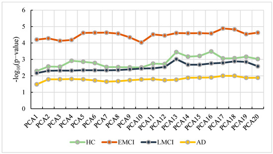 In this study, we used the principal components from population stratification analysis as the covariates for GWAS (linear regression). We separated the participants into four groups based on the diagnosis statues of the participants. To determine the optimal number of principal component analysis (PCA) in our study, we conducted GWAS repeatedly with different numbers of PCA ranging from 1 to 20. Then, we applied the GATEs (gene-based association test that uses extended Simes) method [18] to calculate p-values for genes. Due to the biological significance of APP, we selected APP as the candidate gene to determine the optimal number of PCA. Figure 2 shows the results of APP with different numbers of PCA.