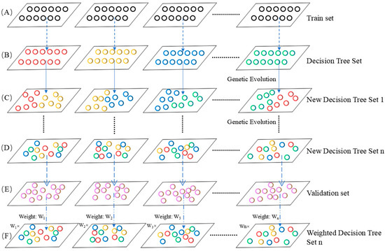 The workflow of genetic weighted random forest. (A) The training set. (B) The decision tree set constructed using the train set. (C) The new decision tree set after genetic evolution for once. (D) The new decision tree set after genetic evolution for n times. (E) The calculation of weight of each decision tree in validation set. (F) The weighted decision tree using the weight from E.