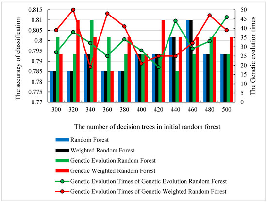 The initial random forest was regarded as the initial population. The decision tree in each group with the best classification accuracy in was picked out for the genetic evolution and two groups of five decision trees were selected as the parents. A new decision tree was generated from the selected parents. Then, the genetic evolution was repeated for n times and n new decision trees were generated. By repeating the steps above for (1, 50) times, we obtained a new random forest.