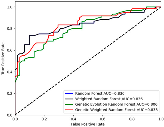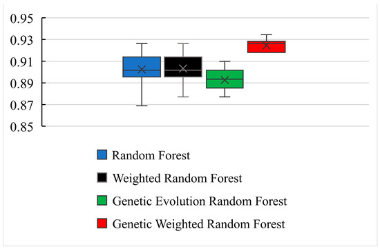As shown in Figure 4, all of the peaks of classification accuracy in four models are 80.99%. The nodes of random forest and weighted random forest are 460, while the nodes of genetic evolution random forest and genetic weighted random forest are (340, 32) and (320, 50). From Figure 5, we find that the AUC values (Area Under Curve) of four models are all above 0.8 and our model has the best AUC of 0.838. Then, we applied the optimal parameters to obtain the final classification accuracy in . The 10 independent experiments were used to ensure greater credibility in our findings. Figure 6 shows the results of 4 models in and Figure 7 shows the ROC curves of the four models in . Figure 8 shows the boxplot of 4 models in 10 independent experiments.