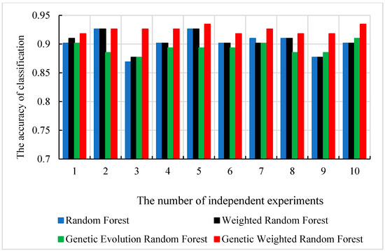 To determine the repeatability of our model, we performed 10 independent experiments. We also applied the traditional random forest, genetic evolution random forest and weighted random forest as the comparison models to verify our model. Moreover, to evaluate the stability of our model, we performed 10 independent experiments and calculated the accuracy with 5 datasets.