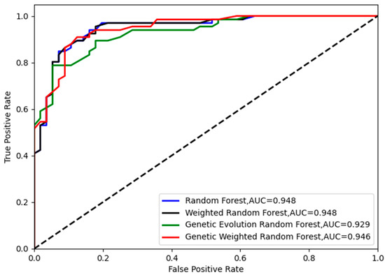 As shown in Figure 6 and Figure 8, the best accuracy is found in our model, and the accuracy of our model is above 91%. The best is 93.44% and the worst is 91.8%. The genetic evolution random forest is lower than our model while the genetic evolution is applied in them. From Figure 7, we find that the AUC values of four models are all above 0.92. Moreover, the random forest model and weighted random forest model have the same classification accuracy seven times, and the other three times, the accuracy of the weighted random forest model is better than the random forest model. This shows that although the use of weights contributes to classification, the improvement is limited. When the genetic evolution was introduced in the random forest, the accuracy changed a lot. There are six times that the accuracy worsens, one time that the accuracy is the same, and only 3 times that it gets better. This shows that genetic evolution introduces changes to decision trees, but the introduced change is not necessarily positive. However, the use of weights after genetic evolution greatly increases the accuracy.
