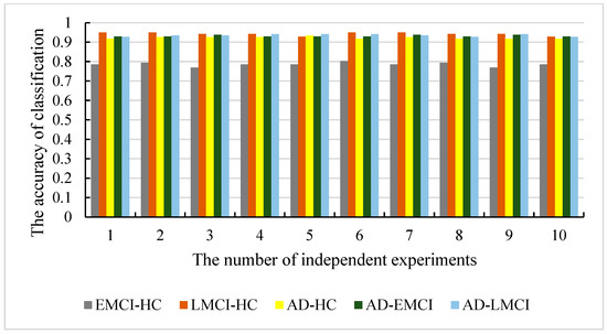 To construct the fused features, we analyzed the MRI and genetic data for each group separately. For the MRI data, we used the 90 brain regions from AAL atlas to calculate the voxels of each participant and saved them as matrices M. The voxel-based MRI data of 1267 participants was used in our work and the number of voxels in 90 brain regions was 43,851. Since there were a total of 43,851 voxels in 90 brain regions, the size of M was 1267 × 43,851. For our binary classification, two sets of data were required in our experiment. So, we obtained the , , and from M according to Table 1, while the size of , , and were 296 43,851, 390 43,851, 271 43,851 and 310 43,851, respectively.
