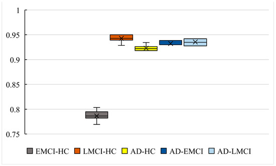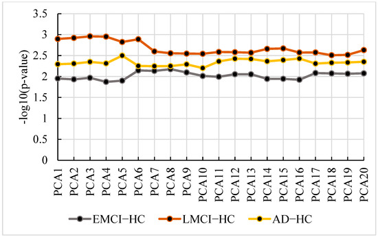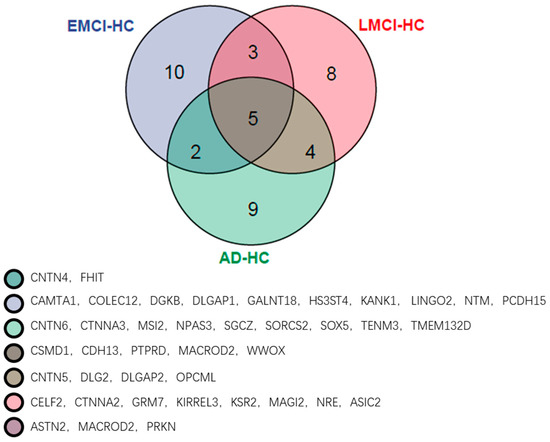From Figure 14, we can observe that there are five of the same top genes in three groups, and these genes are all associated with AD. The numbers of genes in only one group are 10 (EMCI−HC), 8 (LMCI−HC) and 9 (AD−HC), and the numbers of genes between two groups are 3 (EMCI−HC and LMCI−HC), 4 (LMCI−HC and AD−HC) and 2 (EMCI−HC and AD−HC).