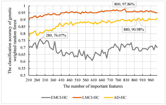 As shown in Figure 4, we find that the optimal numbers of initial random forests of 4 models is 460, 460, 340 and 320, respectively. The training process and training results in random forest model and weighted random forest are roughly the same. The difference between the two models is used as an additional weight coefficient in the weighted random forest. In the 10 independent experiments of , we also found that the accuracy of weighted random forest is better than random forest. This indicates that the weight is able to improve the performance of random forest model. When the genetic evolution was added into random forest instead of the weight, the accuracy of the model fluctuated and no trend was found. In , the genetic evolution random forest did not perform as well as it did with . However, the accuracy became the best in 10 independent experiments when the weight and genetic evolution were added into the random forest. Although genetic evolution did not improve the performance of the decision trees, it changed the features of the decision trees, and the addition of weight made a qualitative change in the model. The accuracy of the new model reached 93.44% and the fluctuation of accuracy was less than 2% in the 10 independent experiments. This suggests that the combination of genetic evolution and weight greatly enhanced the performance and stability of the model. To evaluate the universality of our model, we performed another 10 independent experiments with , , and . From Figure 9, we observe that although the application of genetic data amplifies the differences between imaging features, the accuracy of is the lowest. This may be caused by the smaller difference in features between the EMCI and HC groups. The accuracy of the other four datasets is all above 90% and the gaps of accuracy in the four datasets are all approximately 2%. This proves that our model outperforms the other three models and the features of AD are quite different from the other three groups, as well as the features of the LCMI and HC groups. As shown in Figure 11, we identified the important features of three datasets and the accuracy of the important features were 76.07%, 97.86% and 90.98%, which were similar to the results obtained from . This proves that the results mined by our model are valid candidates for filtering important features. Likewise, there are other neurological diseases for which imaging data and genetic data are available. By fusing the corresponding voxel-based image data and genetic data, it is certainly the case that our model could also be applied effectively to these diseases and we expect to develop further deep learning-based models for a wider range of diseases.
