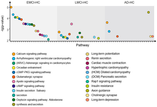 The pathways with corrected p-value < 0.01 of the EMCI−HC group, LMCI−HC group and AD−HC group.