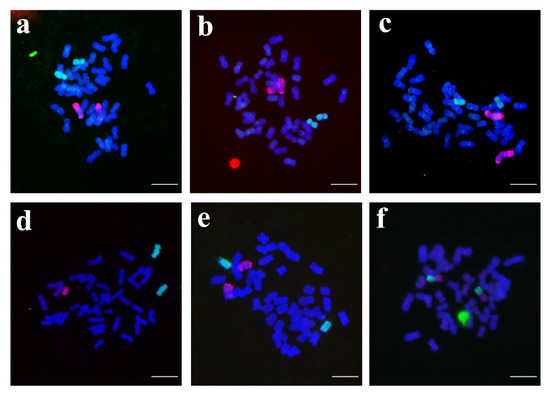 Multicolor GISH of six new breeding lines using Th. elongatum (4×) genomic DNA (green) and rye genomic DNA (red) as probes. Chromosomes were counterstained with DAPI (blue). (a) Line YZU006/1; (b) Line YZU006/5; (c) Line YZU035; (d) Line YZU047/1; (e) Line YZU047/2; (f) Line YZU048. Scale bar = 100 μm.