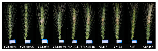 Six new lines were evaluated for FHB resistance and resistance to stripe rust and powdery mildew at the seedling stage. The results showed that all six lines were resistant to FHB, and the resistance level of YZU006/1, YZU006/5, YZU035, and YZU047/1 were similar to those of the resistant variety SU 3 (Figure 4 and Table 3). In addition, YZU006/5 was highly resistant to powdery mildew race E09 and moderately resistant to race A13 (Table 4). YZU006/1 and YZU006/5 showed high and moderate resistance, respectively, to race CYR32 of stripe rust (Table 4). Therefore, YZU006/5 is a new germplasm with resistance to FHB, powdery mildew, and stripe rust, and has potential application value in wheat disease resistance breeding.