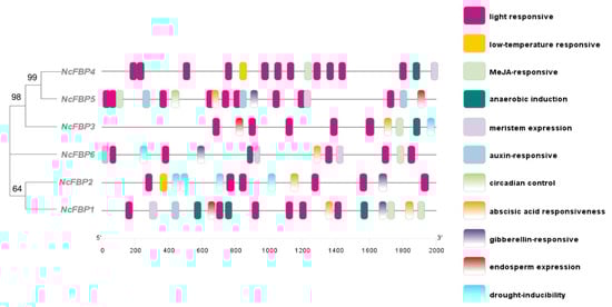 To assess the transcriptional regulation and potential functions of the NcFBP gene family, PlantCARE website was used to predict the cis-acting elements of the promoters of NcFBP gene family (Figure 3). It was found that the promoter sequences of six members of NcFBP gene family contained three kinds of stress-related cis-acting elements (drought-inducibility elements, low-temperature responsive elements and anaerobic induction elements), four kinds of hormone-related cis-acting elements (auxin-responsive elements, gibberellin-responsive elements, abscisic acid responsiveness elements, and MeJA-responsive elements), and four other kinds of cis-acting elements (circadian control elements, endosperm expression elements, light responsive elements and meristem expression elements).
