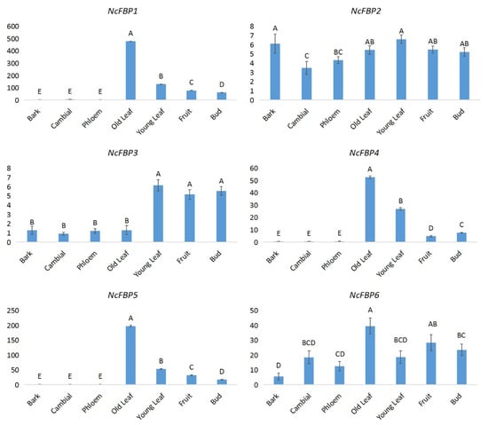 The expression patterns of NcFBPs genes in tissues of N. cadamba. The same capital letters indicate groups that are not significantly different from each other according to Duncan’s multiple range test, p = 0.01.