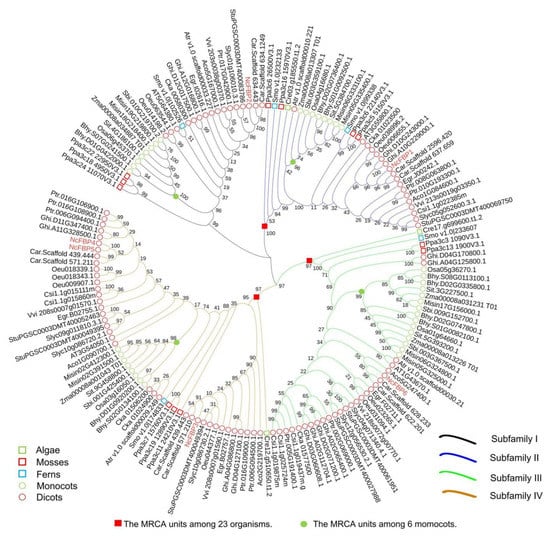To evaluate the patterns of evolutionary and expansion history of these gene families, we broke down the phylogenetic tree into ancestral units and estimated the most recent common ancestor (MRCA) among the 23 species (Figure 5). The results showed that there were only three MRCA shared by the 23 species, and in each subfamily, monocotyledons had specific MRCA, while dicotyledons had no specific MRCA.