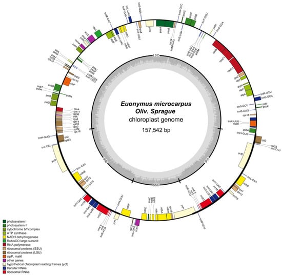 The plant cpDNA carries an average of 120 genes, including genes involved in the gene expression and genes related to photosynthesis [28]. The precise cpDNAs of E. microcarpus, a circular molecule of 157,542 bp displaying a characteristic quadripartite structure as with other angiosperm cpDNAs (Figure 1), 87 potential protein-coding, 38 transfer RNA (tRNA), and eight ribosomal RNA (rRNA) genes (Table 1).