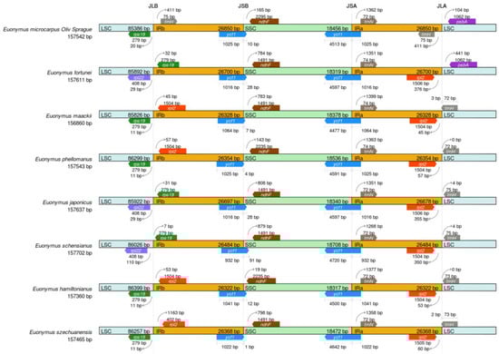 To advance our understanding of the cpDNAs of the genus Euonymus, further investigation was conducted to make critical comparisons of the IR/SSC and IR/LSC border positions in the eight selected Euonymus species, to access the degree of IR expansion or contraction among them. As shown in Figure 5, a large variability of the junction sites was observed in the eight cpDNAs, of which the LSC, IRa/b, and SSC regions have an average length of 86,001 bp, 26,513 bp and 18,441 bp, respectively.